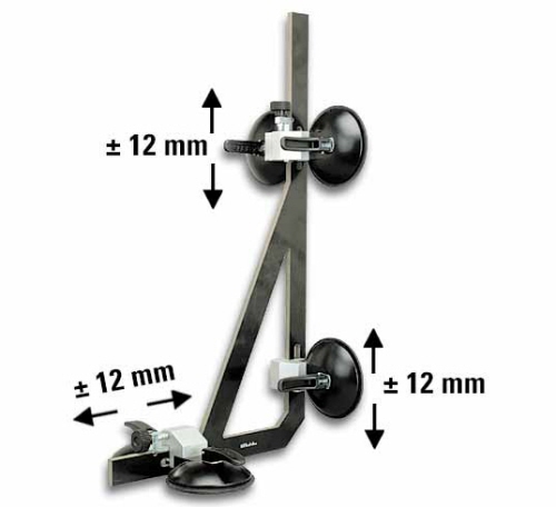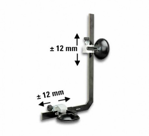 Angle Suction Holder, adjustable from 45° to 300°, Positioning aid with two suction pads (Ø 120 mm) and special sealing lip, suction pads adjustable +/- 12 mm, can be fine adjusted to each other, sturdy plastic arms are 194 mm long and are connected to each other by a joint.