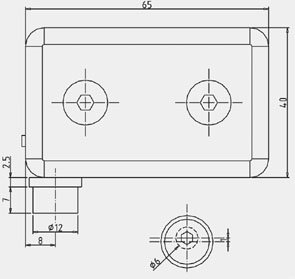Glass Door Hinges for 6 mm to 8 mm Glass, flush mounted, 65 x 40 mm, made of aluminium bronze, chrome plated.